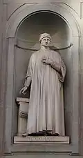 The project was restarted in 1834-1835 as an initiative of the editor and philanthropist Vincenzo Batelli,[2] who wished to celebrate the Italian genius. Initially, he hoped to fund his project with a public subscription and engage young local artists, early in their careers.[3] Public funding, however, fell far short of what was needed. In 1842, the Grand-Ducal government selected a "Florentine Deputation to complete the decoration of the Logge degli Uffizi and honor Illustrious Tuscans". The deputation selected the subjects and approved the statues based on designs with no modifications allowed.[4] Their choices guided by the government of the Grand-Duchy. For example, the suggestions for including Frate Guittone d'Arezzo (1230 – 1294) and the jurist Cino da Pistoia (1270 – 1336) were declined. Ultimately the project was funded by a lottery, and experienced sculptors were patronized. Prior to installation or completion of the statues following sculptors died: Bartolini, Pampaloni, Pozzi, Nencini, Leoni, and Torrini.[5] The original sculptor for the statue of Guicciardini declined the commission, believing the historian had not been evil.?! The series was completed in 1856.[6]