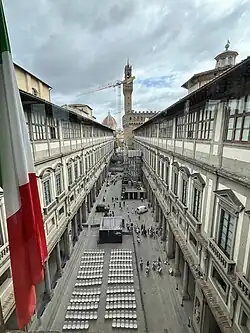 The Loggiato is the semi-enclosed courtyard (Italian: cortile) space between the two long galleries of the Uffizi Gallery located adjacent to the Piazza della Signoria in the historic center of Florence, capital of Tuscany, Italy. Because the facade of the arcaded corridor parallel to the Arno River also continues the sculptural display of the cortile, it can also be included in the description.