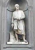 In addition, to hosting the entrance to the museum housed in the upper galleries, the loggiato is known for its display of statues of famous Tuscans housed in niches carved from the inner ground floor pilasters. It is stated that Cosimo I de Medici for his original plan for the Uffizi planned to display statues of famous Tuscans in the ground floor. In 1574, just before the death of Cosimo, the sculptor Vincenzo Danti had his statue of the former Duke placed in the ground floor.[1] His son, Francesco, in 1584 substituted this statue with one by Giambologna, standing on a plinth on the second floor, above the arches of the interior of the river corridor, with Cosimo flanked by two figures, Rigor and Equity. However, not until the middle of the 19th century, was such an ambitious plan to display a statues of 28 famous Italians active in Tuscany was put into effect.
