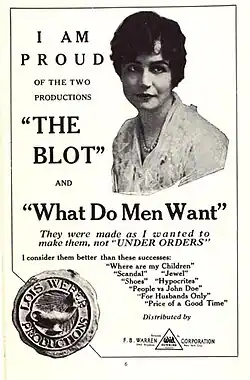 After reading the articles "Impoverished College Teaching" and "Boycotting the Ministry" in the April 30, 1921, issue of Literary Digest about the underpayment of educators and clergy, Weber, with scenarist Marion Orth, crafted a melodramatic narrative to bring the issue to life in The Blot.[210] Starring Claire Windsor and Louis Calhern,[211] The Blot was her masterpiece,[72] her most successful film from this period[212] and probably Weber's best-known film today.[207] The film "rejects the values of capitalist America that measures the value of people in wealth and property" by depicting the compromises and choices impoverished women are forced to make to achieve social mobility and financial security.[212] It "condemns capitalistic materialism and linked consumerism with sexual exploitation",[157] and addresses class, money, and ethnicity.[213] "Weber's basically Christian ethos shines clearly through this plot: the text disapproves of both the new consumerist immigrant class, and the old aristocratic one".[205] Despite xenophobic assumptions,[214] Weber advocates learning, asceticism, and service to the needy.[205]