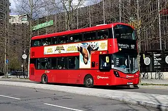 On 10 September 2011, route 97 was extended from Leyton to Stratford City bus station to coincide with the opening of Westfield Stratford City.[7] On 31 August 2013, the route was diverted to serve the new residential precinct around the Queen Elizabeth Olympic Park.[8] Sister route 97A operated from 1981 and 2000 between Chingford and Walthamstow Central with various extensions to Leyton, Hackney and latterly Whipps Cross. It was replaced by route 357.