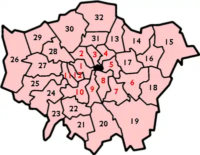 - Havering (Borough 15) – after the former Royal Liberty of Havering which covered a similar area