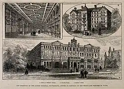 The London Hospital Medical College (bottom) on a wood engraving of 1877