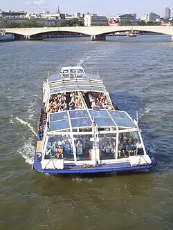 Numerous proposals for "river bus" services were considered throughout the 20th century, although the few that were realised were cancelled after a short time in service.[12] During World War II, from 13 September 1940 to 2 November 1940, a temporary wartime river bus service was introduced, running every 20 minutes, between Westminster and Woolwich using converted pleasure cruisers provided by the Port of London Authority to replace train, tram and trolleybus services which were disrupted by the bombing of the Blitz. London Transport bus inspectors and conductors issued and checked the tickets on board the boats.[13][14]
