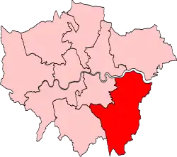 United Kingdom Parliamentary constituencies were redrawn in 1983 and the European constituencies were altered to reflect this. The new seat comprised the following Westminster constituencies: Beckenham, Bexleyheath, Chislehurst, Eltham, Erith and Crayford, Greenwich, Old Bexley and Sidcup, Orpington, Ravensbourne and Woolwich.[2] These boundaries were used in 1984 and 1989.[3] Greenwich was removed for the 1994 European Parliament election.[4]