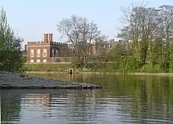 During the First World War, Bushy Park was used to station Canadian troops, and during the Second World War was used by the USA Air Force. General Eisenhower was based there when the Allied invasion of north-west Europe was planned, which began with the D-Day landings. Most of the associated huts had been removed by 1963,[5] but the park remained in military occupation, as the Admiralty used it as a research establishment during the Cold War. By the time military use had ceased in the early 1990s, much of the site was overgrown and damaged, but a group called the Friends of Bushy and Home Parks was formed, and began to research what was there. Aided by the discovery of an eighteenth-century painting of the park and archaeological investigation, a restoration programme for the whole park was developed, for which funding of £7.2 million was provided by the Heritage Lottery Fund, the Royal Parks and others. Preliminary investigation work began in 2006, with the main part of the project starting in January 2008, which involved dredging large volumes of silt from the ponds, restoring them to their original shape, and overhauling the water engineering system, to reconnect them to the Longford River. The cascades and flank walls were restored using original stonework and bricks where they could be found.[6] The Longford River had been diverted by the Admiralty in 1953 while they were using the park, which had resulted in 5 feet (1.5 m) of silt building up in the ponds. Its removal revealed two extra steps of the cascades. The river was returned to its earlier course, and water flowed down the cascades for the first time on 15 September 2008. A new bridge was constructed over the river to link the Brew House to the water gardens, and the Baroque water gardens were reopened to the public in 2009. The cost of restoring them was £780,000.[7][8]