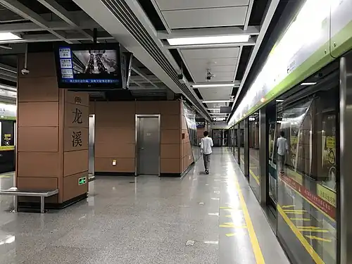 Longxi Station (Chinese: 龙溪站), formerly Huaboyuan Station (花博园站) during planning,[1] is a metro station on the Guangfo Line of the Guangzhou Metro.[2] It is located under Longxi Avenue (龙溪大道) in the Liwan District of Guangzhou, near the Guangzhou Luxin Garden (广州鲁新园艺场).[3] It started operation on 3 November 2010. This is the first station in Guangzhou when travelling eastbound on the Guangfo line.