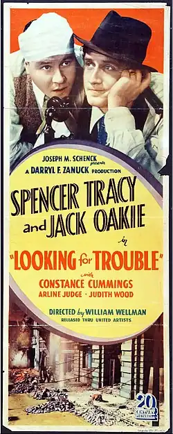 Looking for Trouble is a 1934 American Pre-Code crime film directed by William A. Wellman and starring Spencer Tracy, Jack Oakie and Constance Cummings.[1] After he is rejected by a woman, a man leaves his safe job and joins a gang that robs banks. The film, set in Los Angeles and Long Beach, California features actual stock footage from the 1933 Long Beach earthquake.