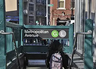 The Metropolitan Avenue station (also announced as the Metropolitan Avenue-Lorimer Street station) on the IND Crosstown Line opened on July 1, 1937 as part of the extension of the Crosstown Line from Nassau Avenue to Hoyt-Schermerhorn Streets.[18] The station also has two tracks and two side platforms.[39] The G stops at the station at all times.[40] The station is between Nassau Avenue to the north and Broadway to the south.[36]