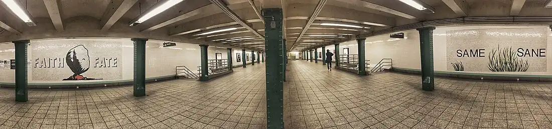 The artwork in the transfer passageway and the Crosstown Line mezzanine is called Signs of Life,[23] designed by Jackie Chang in 2000.[24][25] Signs of Life is made of ceramic tiles of glass and consists of numerous juxtaposed words and icons.[24] The words in the artwork are compound words that have been taken apart, such as "useless" or "mankind".[23] In designing the artwork, Chang intended for the pieces to be "challenging" and cryptic.[24] Signs of Life originally consisted of six mosaics, but two additional mosaics were added when the station's elevators opened in 2024.[22]