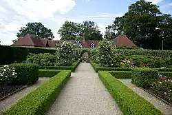 The walled garden, based on a design by Gertrude Jekyll, contains a series of "rooms" with different themes running through them. The redevelopment of the garden commenced in 1993/4 with the Rose Garden and continued with the Herb Garden, Flower Garden, White Garden and, most recently, the organic Vegetable and Cut Flower Garden. The gardens are surrounded by an old wall of similar age to the house and contain a vine walk, a huge spread of wisteria, the moat and moat walk, and the old mulberry tree around which a family prophecy revolves.[6]