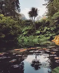 The gardens include aged and colossal rhododendrons and camellias, a series of lakes fed by a ram pump over 100 years old, highly productive flower and vegetable gardens, an Italian garden, and a wild area filled with subtropical tree ferns called "The Jungle". The gardens also have Europe's only remaining pineapple pit, warmed by rotting manure, and two figures made from rocks and plants known as the Mud Maid and the Giant's Head.