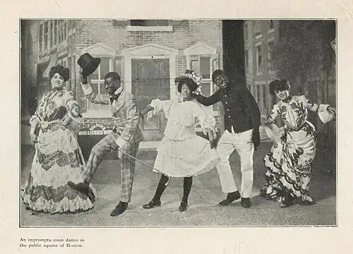 The musicals In Dahomey and Abyssinia in particular have been cited as two groundbreaking works in the evolution of the American musical comedy and two important early African-American musicals.[15] In Abyssinia Lottie was the featured singer in the song "Answer's That You Don't Expect to Get"[14] a song through which her character Miss Primly was used to critique and mock the social mores of respectability in relation to sex and marriage as placed on women, and in particular black women, in early 20th-century America.[16] In In Dahomey she was featured as a cakewalk dancer,[17] and her character of the widow Mrs Stringer was a comedic part in which she portrayed a fashion editor for the newspaper Beanville Agitator who was also a seller of "forsaken" sewing patterns.[18] Lottie's association with the cakewalk dance began prior to In Dahomey. When Scott Joplin's "Maple Leaf Rag" was first published in 1899 she was one of four cakewalk dancers depicted on the cover of the sheet music.[5]