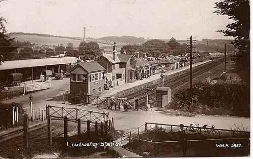Loudwater station was located at the bottom of Treadaway Hill close to the M40 bridge and served both Loudwater and Flackwell Heath. It opened in 1854 and the station became a halt in 1968 because of decreased service on the line. The station was closed and demolished in 1970.[2] The site is now an industrial park, although at the rear of the park the old railway tunnel under the M40 is still in place. A railway conservation path towards High Wycombe follows the route of the former railway.