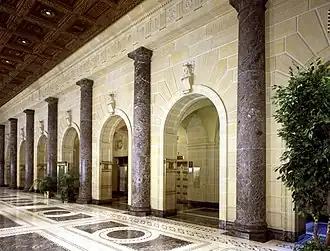 By mid-1927, Ayres was proposing a grandiose building to anchor the western end of Federal Triangle. The proposed building had 1,605,066 square feet (149,115.5 m2) of interior space (more than 60 percent larger than originally planned).[41] The structure was essentially rectangular, with seven wings and six interior courtyards that was one city block wide and three blocks long.[42] There were 15 entrances and 16 interior stairways.[42] Its seven stories were clad in granite and limestone.[42] More than 8 miles (13 km) of corridors accessed 37 acres (15 ha) of office space designed to house 10,000 workers, accommodate 8 million patents in a publicly accessible manner, include a public aquarium with 40 tanks and 2,000 fish, and house a 200,000-item library.[42] Ayres asked James Earle Fraser (sculptor), a sculptor and colleague on the Commission of Fine Arts, to design and sculpt the various external features of the building.[35] At first Fraser said he had far too many other commissions and could not work on the Commerce building, but Ayres and Fraser developed a cooperative work style that eventually was adopted for most of the buildings in the Federal Triangle: Fraser consulted with Ayres and other architects to develop appropriate themes and content and then built or fashioned models of his designs.[35] Then his assistants enlarged the models into full-scale sculptures and did the physical work of actually carving the art.[35] Ayres designed four massive pediments for the building, which Fraser filled with sculptures with the themes "Aviation," "Mining," "Fisheries," and "Foreign and Domestic Commerce."[35] Ayres contracted with interior designer Barnet Phillips to design and implement the interior elements of the building.[43] Ayres had planned a main lobby that was Neoclassical in design.[43] Phillips designed rusticated walls, placed arches over every doorway, placed Doric columns throughout the lobby, added a painted and coffered ceiling, and laid terrazzo and marble down for the lobby floor.[43]