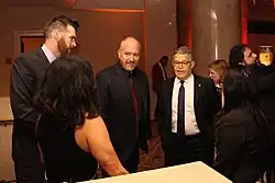 On December 31, 2018, an audience member secretly recorded C.K. working out new material and posted it online, which drew media controversy.[176][177] Included in his set were jokes about school shootings, which drew a divided reaction from fellow comedians.[178] Ricky Gervais defended C.K.'s jokes, saying "[C.K.'s] got nothing against those [Parkland] kids. It was him pretending to be angry for comedy."[179] In October 2019, C.K. announced in an email to subscribers of his website an international tour of his new material.[180][181][182] Following the leak of his new material in December 2018, his future shows would require audience members to lock cell phones and other devices in Yondr pouches, which has become the norm, with comedians Dave Chappelle, John Mulaney, and Aziz Ansari using them as well.[182] Canadian comedian Mark Breslin, owner of Canadian comedy club chain Yuk Yuk's, defended his decision to book C.K. again in Toronto, citing sold out tickets for five shows[183] and a lack of controversy.[184]