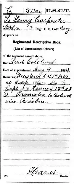 - "L. Henry Carpenter", "Lt. Col." "5th U.S. Colored Troops." Promoted "Colonel" and listed as "vice Brisbin" on roster card. Lt. Col. James S. Brisbin, Fifth U. S. Colored Cavalry was later promoted to colonel and took command of the 6th United States colored Cavalry (USCC) and Carpenter took command of the 5th USCC.