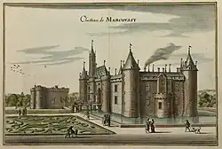 Many of these reconstruction efforts were centred on his main estate in Marcoussis, but he undertook reconstruction works in many places. For example, the churches in Arpajon, Dourdan, Héricy, Malesherbes, Marcoussis and Milly-la-Forêt, all south of Paris, as well as that of Ingouville in Normandy, were repaired, rebuilt or enlarged thanks to support from Louis between 1470 and 1516.[51] Malet de Graville furthermore engaged in updating the legal framework surrounding the estates, putting local managers in place and reorganising archives.[52] He also built town fortifications, mills, dovecotes, ordered the clearing of old and digging of new fish ponds, and in Arpajon and Milly-la-Forêt built large market halls which are still standing.[53][54][35] The impact of the reconstruction efforts of Louis were thus substantial. In Milly-la-Forêt, for example, he financed the construction of the market hall, repaired the church and enlarged the castle he had bought there.[43][47]