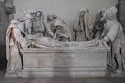 The activity of Louis also extended to commissioning works of art. Among these is a sculpture group depicting the Entombment of Christ, ordered in 1495 and installed in the chapel of his castle in Malesherbes.[55] The Entombment was made by a sculptor resident in Paris but probably from Antwerp, Adrien Wincart, based on designs by the Coëtivy Master.[56][57] It has since been moved to the town church in Malesherbes. The French historian Catherine Grodecki described it as one of the most beautiful Entombments from the end of the Middle Ages.[58]