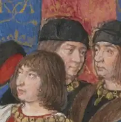 Louis thus stepped into his father's shoes as an aide to King Louis XI. He was introduced to the court by his uncle, Jean de Montauban.[16] A first recompense for his services to the king is dated 1470. In 1472, possibly to negotiate with the rebellious Count John V, he undertook a trip to the County of Armagnac, a delicate journey indicating that Louis enjoyed a high degree of trust from the king early on.[17] From the following year, Louis is noted with the same titles as his father once had at the court, counsellor and chamberlain.[17] In 1475, he was promoted to the important post of head of the Gentilshommes ordinaires de la Maison du Roi, i.e., the royal lifeguard.[18] In 1476, he was entrusted another delicate assignment which he carried out successfully, namely to convince Charles IV of Anjou to cede part of his inheritance to the French king. The same year, Louis was assigned to be one of the judges in the process against Jacques d'Armagnac, another central part of French politics at the time.[19] He also participated in the military operations following the death of the Duke of Burgundy Charles the Bold in 1477, with the objective of securing former Burgundian lands for the French crown.[20]