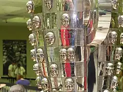 Meyer's name and likeness among the winners memorialized upon the Borg-Warner Trophy - Meyer was the inaugural awardee of the trophy in 1936