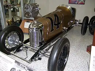 In 1928, Phil Shafer's intended Miller entry went up for sale, and Alden Sampson bought the car for Meyer.[1] Meyer passed the rookie test, qualified thirteenth, and took the lead on Lap 181; he won by a margin of 25 seconds, at an average speed of 99.5 mph (160.1 km/h).[1] The same year, Meyer won a 200 mi (320 km) event at the 1+12 mi (2.4 km) board track at Altoona, Pennsylvania, at an average speed of 117.02 mph (188.33 km/h), in a Stutz-Miller.[1] He earned consistent points finishes to make him AAA's National Champion.[2] He would claim the title again in 1929 and 1933.[2]