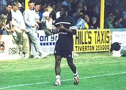 Saha quickly made an impact on his Fulham debut, scoring his first goal of the season in a 2–0 win against Crewe Alexandra in the opening game of the season.[26] This was followed up by scoring in a 3–1 win against Birmingham City.[27] Since making his debut, Saha quickly established himself in the first team, becoming the club's first-choice striker and along with John Collins and Lee Clark. Their performances were described "world class" by the Evening Standard.[28][29] He then scored eight goals in four matches in September 2000, scoring once against Nottingham Forest, braces against Northampton Town and Burnley, and a hat-trick against Barnsley.[30] His goalscoring form continued with three goals in two matches against Grimsby Town on 25 November and Derby County on 29 November 2000.[31] Saha scored two goals in two matches between in January 2001 against Norwich City and Watford.[32] He then scored twice for the side in a 4–1 win against Tranmere Rovers on 30 March 2001.[33] Saha scored three goals in two matches between in April 2001 against Portsmouth and Wolverhampton Wanderers.[34] In the promotion-winning campaign of 2000–01 Saha scored 27 league goals to fire Fulham into the Premier League, making him the league top–scorer.[35] At the conclusion of the 2000–01 season, he made 48 appearances and scored 32 times in all competitions. For his achievement, Saha was named PFA Team of the Year.[36]