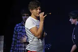 In 2010, Tomlinson auditioned for the seventh series of the singing competition The X Factor in front of main judges Simon Cowell and Louis Walsh and guest judge Nicole Scherzinger. He sang a rendition of "Elvis Ain't Dead" by Scouting for Girls before Cowell requested he sing another song.[16] He then sang "Hey There Delilah" by the Plain White T's and received three yeses from the judges, sending him through to bootcamp.[17] He failed to progress to the "Boys" category at the end of the final bootcamp stage of the competition at Wembley Arena, London, in July 2010. However, after a suggestion from Scherzinger, he was put together with Niall Horan, Zayn Malik, Liam Payne and Harry Styles to form a five-piece boy band called One Direction, thus qualifying for the "Groups" category at judges' houses, mentored by Cowell.[17]