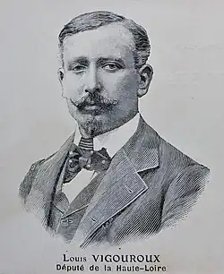 Louis Vigouroux was born on 25 August 1865 in Le Puy-en-Velay, Haute-Loire.[1] He studied classics at the Lycée du Puy, then studied at the Faculty of Law in Paris, earning his license in 1891. He became a Professor of Political and Industrial Economics at the Free College of Social Sciences. For two years he also headed the section of financial studies of the Crédit Lyonnais. He held liberal views, which were expressed in his contributions to the Nouveau dictionnaire d'économie politique published in 1890 under the direction of Léon Say and Joseph Chailley, works for the Liberal Association for the Defense of Labor and French trade, and articles in the Monde économique, Journal des économistes and Revue politique et parlementaire, among others.[2]