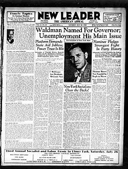 Waldman continued to play a leading role in the new SDF organization. An organizational meeting was held of the new group in early July, at which Waldman sought to endorse Franklin Delano Roosevelt for President of the United States in lieu of the Socialist nominee, Norman Thomas. The gathering found itself split on the issue, however, and no endorsement was forthcoming.[14] Waldman's foes, such as New York Socialist Party Executive Secretary Jack Altman and Socialist candidate for Governor Harry W. Laidler were quick to attack Waldman, charging him with a "betrayal of Socialist principles" in attempting to "divert 100,000 Socialist votes to the Roosevelt column."[14]
