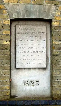 A 1926 extension with rooms for officers' wives and children was intended to offer medical facilities at "moderate charges" to women of the officer class, matching what was available to their menfolk.[8] Queen Mary was said to be interested in this new policy of the military authorities and granted permission for a new extension to be called the Queen Mary Wing. This wing was in fact two separate "unpretentious" extensions to east and west which blended in with the original building and provided accommodation for up to six women and eight children.[9] The Queen made donations towards it: a cheque, linen and silver plate with her crest on.[10] She also presented the hospital with a rocking horse and brass cot once used by Edward VIII.[10] After unveiling a stone tablet in the wall and naming the new wing,[9] she continued to visit the hospital regularly, as she had already been doing for several years.[10] Her visits to the hospital and to a nearby children's home named after her could be combined with frequent royal visits to inspect military activities like cavalry training.[11]