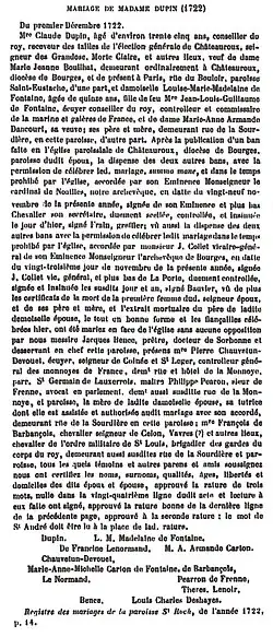 - ^ Barthélémy Mouffle d'Angerville: Vie Privée de Louis XV : ou principaux événements, particularités et anecdotes de son règne, vol. 1, London, ed. John Peter Lyton, 1 December 1780 (repr.1796 under the title Siècle de Louis XV) (1st ed. 1781), 398 p. online, chap. XXXIII, pp. 288-290. The book is published in the Kingdom of Great Britain for fear of censorship and lawsuits. Gaston de Villeneuve-Guibert in his book of 1884, Le portefeuille de madame Dupin, mentions that Jeanne-Marie-Thérèse de Fontaine was accompanied by her mother and doesn't reported the return to Paris with Claude Dupin.