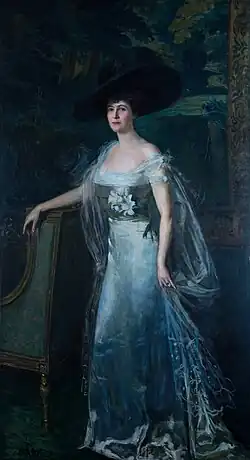 Hill traveled to New York City, to Newport, Rhode Island, and to Paris. While in England, she was presented at the court of King Edward VII. During this audience, she wore a satin gown embroidered with diamonds and had a red velvet cape trimmed in 14-karat gold.[8] She became the first person in Denver to entertain a president when William Howard Taft visited. He was met by a red carpet, an orchestra, and Hill's sons wearing white satin suits.[9] She was politically active, involved in Republican Party women's clubs.[1] Her sons married and moved to Newport, where she visited them. She continued to travel to Paris, London, and New York City.[9]