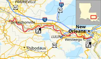 Louisiana Highway 18 (LA 18) is a state highway that serves Ascension, St. James, St. John the Baptist, St. Charles, and Jefferson Parishes. Called the Great River Road, it runs from west to east, parallel to the west bank of the Mississippi River, running from Donaldsonville to Gretna. It spans a total of 79.7 miles (128.3 km).[1] In the more rural parts of LA 18's span, it is commonly referred to as River Road, but it becomes 4th Street once it enters Westwego.