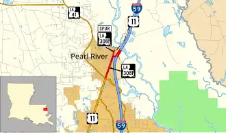 In 1964, concerns over the safety of the U.S. 11 West Pearl River Bridge, built in 1926,[1] led to its closure, and U.S. 11 was detoured onto the recently opened, parallel I-59.[2] This re-routing was made permanent the following year, and the old route north to its junction with I-59/U.S. 11 at Exit 5B was designated as LA 3081. (The remainder of Old U.S. 11 to the Mississippi state line became a local road until its abandonment in the early 1970s.)[3] The West Pearl River Bridge was reconditioned in 1968 to serve local traffic until the interchange of I-59/U.S. 11 with LA 41 (later LA 41 Spur) was constructed nearby[4] (Exit 5A). Once completed, the West Pearl River Bridge was abandoned, and LA 3081 was shortened to a terminus at the west bank of the river.