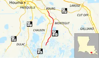 Louisiana Highway 55 (LA 55) is a state highway located in Terrebonne Parish, Louisiana. It runs 14.09 miles (22.68 km) in a north–south direction from a dead end south of Montegut to a junction with LA 24 in Klondyke.