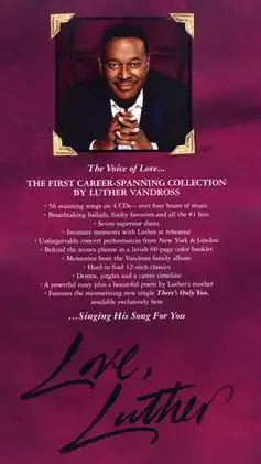 Love, Luther is a four disc box set chronicling the musical career highlights of Luther Vandross. Promoted by the single "There’s Only You," the set includes unreleased demos, full-length album versions of Vandross' hit songs, and several of his productions for other artists.