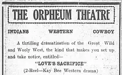 Love's Sacrifice is a 1914 American short silent Western film directed by George Osborne and featuring William Ehfe, Tsuru Aoki,[2][3] Black Bull and Virginia Philley Withey in important roles.