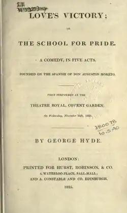 Love's Victory is an 1825 comedy play by the British writer George Hyde. It premiered at the Theatre Royal, Covent Garden in London on 16 November 1825.[1] The original cast included Charles Kemble as Don Cesar, Prince of Naples, John Duruset as Don Luis, Prince of Bearne, Daniel Egerton as Don Diego, Duke of Barcelona, Tyrone Power as Gaston, Prince of Foix, William Farren as Don Pedro, William Blanchard as Lopez and Maria Ann Lacy as Princess Diana.[2] It was inspired by the seventeenth century Golden Age Spanish work El desdén, con el desdén by Agustín Moreto, which was also adapted by Molière.[3] It published the same year by Hurst, Robinson of Waterloo Place in London and Constable in Edinburgh.