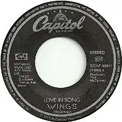 "Love in Song" is a song credited to Paul and Linda McCartney that was released on Wings' 1975 album Venus and Mars. It was also released as the B-side of Wings' number 1 single "Listen to What the Man Said." It has been covered by artists such as Helen Merrill and the Judybats.[1]