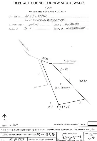 - ^ a b c d e f g h i j k l m n o p q r s t u v w x y z aa ab ac "Lower Hawkesbury Wesleyan Chapel and site". New South Wales State Heritage Register. Department of Planning & Environment. H00576. Retrieved 2 June 2018.