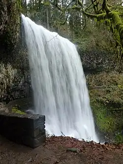 Lower South Falls is created along the course of South Silver Creek and it sits on the west section of Silver Falls State Park Trail of Ten Falls, along Canyon Trail, a mile north of South Falls.[3] Lower South Falls is one of four waterfalls in the Park where the trail passes behind the falls.