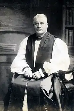 Clarke was approached for nomination as Bishop of Melbourne and announced his acceptance of this in early September 1902.[3] The following month he received the degree Doctor of Divinity (DD) from the University of Cambridge.[4] He was consecrated Bishop by the Archbishop of Canterbury in St Paul's Cathedral, London, on 1 November 1902,[5] and arrived in Melbourne in February 1903. Since the resignation of Bishop Goe the area of the Diocese of Melbourne had been greatly reduced by the formation of new dioceses based in Bendigo, Wangaratta and Gippsland. When Clarke began his ministry he appointed a commission to document the present position and future needs of the diocese and later came to the conclusion that certain parishes had become too large and needed subdividing, that means must be found for a more complete training of the clergy, and that there must be an extension of secondary education by means of church schools. A pioneer of ecumenism, he was a member of the Council of Churches in Victoria and its president in 1904. In 1905 Clarke became first Archbishop of Melbourne and Metropolitan of Victoria. He ruled his diocese firmly and refused to allow himself to be allied to any party. Recognising that what may be called the puritanical and the aesthetic types of mind are permanent in human nature, he felt that the safest approach would be found in a middle course, and that no good would be done by straining for uniformity in minor issues. In practice, however, Clarke generally opposed evangelicals, as exemplified by the forced resignation of C. H. Nash.[6]