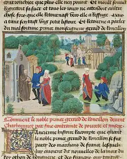 Liédet was a prolific artist coming from Hesdin in Artois. Between 1454 and 1460 he worked in Hesdin where he produced 55 thumbnails for La Fleur des Histoires by Jean Mansel, commissioned by Philip the Good of the House of Valois-Burgundy. He also illustrated Royal Library of Belgium MS 9967, a copy of Jehan Wauquelin's edition of La Belle Hélène de Constantinople and 20 miniatures for Mystère de la Vengeance de Nostre Seigneur Ihesu Crist (Mystery of The Vengeance of Our Lord Jesus Christ) by Eustache Marcadé for Philip, now in the British Library.[1][2]
