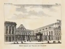 Engraving for page 22 (volume II) of the first edition of Luc-Vincent Thiéry's Guide des amateurs et des étrangers voyageurs à Paris, ou Description raisonnée de cette Ville, de sa Banlieue, et de tout ce qu'elles contiennent de remarquable, published in 1787, showing the Monument du Palais de Justice.