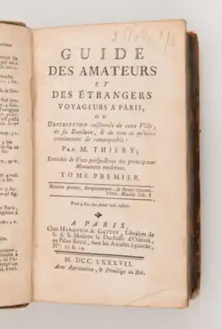 In the years 1783, 1784 and 1785, Thiéry's publisher, Libraire Hardouin à Paris, published his Almanach du Voyageur à Paris. With the edition of 1785, the editor announced that a new and more comprehensive guide in two volumes will follow. Two years later, in January 1787, together with an updated version of the Almanach du Voyageur à Paris, the first edition of the Guide des amateurs et des étrangers voyageurs à Paris, ou Description raisonnée de cette Ville, de sa Banlieue, et de tout ce qu'elles contiennent de remarquable was published. The publication was dedicated to Pierre-Charles Laurent de Villedeuil.[3][2]