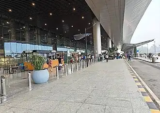 In 2018, Suresh Prabhu, the then Minister of Civil Aviation, announced that a new third passenger terminal building will be constructed with an area of 111,362 m2 (1,198,690 sq ft), including a basement area of 20,461 m2 (220,240 sq ft) and a connecting corridor between Terminals 2 and 3, which will cover an area of 6,646 m2 (71,540 sq ft). To be built in two phases, the first phase will be able to serve more than 13 million passengers annually. It has been built at a cost of 1,383 crore (US$160 million), which is now estimated at 2,400 crore (US$280 million).[12] The Peak-Hour Handling (PHP) capacity of the new terminal is 4,000 passengers, of which 3,200 is domestic and 800 international.[27] There are a total of 75 check-in counters, of which 60 are for domestic and 15 for international passengers, and 18 check-in kiosks for passengers travelling through the terminal.[28] It is equipped with six aerobridges, which will be increased to eight after the completion of the second phase, through which the passengers can board directly to the flight from their respective boarding gates.[28] It has 30 lifts and 5 escalators.[28] In January 2018, the construction of the terminal building was started by Nagarjuna Construction Company (NCC). All design and interiors have been designed based on the Frankfurt Airport in Frankfurt, Germany, by the British architectural firm, Pascall+Watson. The second phase, which includes the extension of part of Terminal 3 after demolition of Terminal 1 and constructing a connecting corridor between Terminals 2 and 3 will be completed in the next five years.[21] On 25 February 2019, the Adani Group was awarded with the operations and expansion of the existing as well as the new Terminal 3.[29][30] It is a multi-storeyed terminal building with departures at the first floor and arrivals at the ground floor. The terminal's architecture will endeavour to express the position of Lucknow as a key city and will display the traditional culture and heritage of Uttar Pradesh. The building is also provided with interior decorations to match the modern structure and enhance passenger experience.[31] Along with the terminal, a multi-storey parking facility is also under construction, which will have a parking of 1,500 vehicles. Also, over 5 km (3.1 mi) of storm water drains have been constructed parallel to the runway on either side to facilitate the outflow of the water into the Bijnor Canal. Terminal 3 was inaugurated and opened by Prime Minister Narendra Modi on 10 March 2024.[7][26]