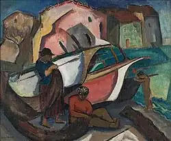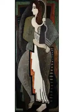 L'Engle's early style was Cubist, based on her association with Albert Gleizes.[27] Later, she said she felt she could continue for a long time to express herself in that mode,[8] but then, as later, her approach was eclectic and she also painted in a more individual style which reminded critics of fellow Provincetown artists, Oliver Chaffee[28] and Agnes Weinrich[29] whose manner of painting could not be easily pigeon-holed. The paintings, "Boats on the Beach at Cavalaire" of 1923 (shown at left) and "Standing Figure" of 1927 (shown at right) illustrate her early style. Writing in 1928 of a complex work showing an interior view with mirror and a through view to a tall building outside, Elizabeth L. Cary of the New York Times credited L'Engle with a "clear precision" and said the work "succeeds quite remarkably in keeping everything in its separate plane without insistence on planar perspective."[30] As a member of a small group of women exhibiting in 1930, L'Engle subscribed to a practice of evolving "a more modern American style," one that was more in keeping with 20th Century American life than are the prevailing Continental designs."[23] Noting that L'Engle seemed to have stopped making pure abstractions, Helen Appleton Read of the Brooklyn Daily Eagle wrote in 1931 that L'Engle appeared to have been "always at heart a painter with a painter's sensuous enjoyment of the medium itself."[2] In 1932, when L'Engle showed with Adelaide Lawson and Alice Newton a critic for the New York Evening Post said "her interest in abstractions has enabled her to build up a solid structure of organic design.[1] In 1934,[31] 1936,[32] and again in 1943[33] critics called attention to her skill in composition. During the late 1940s L'Engle painted pure abstractions that Howard Devree called "bright" and "well-organized."[34] The painting, "Two Nuns," (at left) shows L'Engle's representational style of the 1930s and 1940s and her "Graffiti," (at right) is an example of a pure abstraction from the late 1940s and early 1950s. Later in the 1950s she made montages incorporating metal foil, wire, wood, plaster, and broken glass as well as paint.[26] She became interested in archaic Greek statues in the 1960s and, during that period, exhibited drawings of pieces she found in the Athens Museum.[5][35]