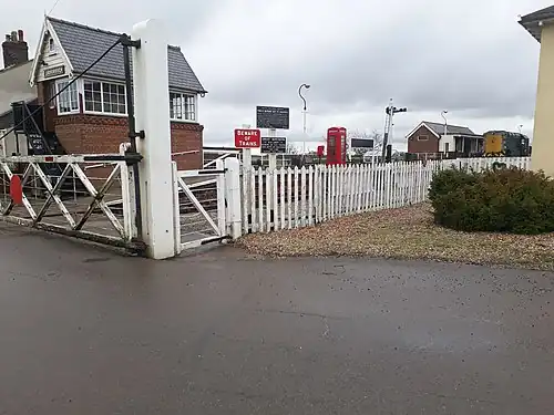 With the order in place, this allowed the company to acquire track, locos and rolling stock with the society supporting the company as much as it can. The company (now trading as the Lincolnshire Wolds Railway) have had to rebuild all of the station's facilities, including a replica Great Northern signal box in its original position, a two-road locomotive shed and a passenger waiting room which houses a museum and shop.[18][11] In 1997 the level crossing was relaid and allowed access over the road for the railway to bring rolling stock that had been stored on the north side of the crossing. Between 2001 and 2004, the north (down) platform was developed with a toilet block, garden and running in board.[16] By this point, the track extended north for a distance of ¾ of a mile.[16] A major step for the LWR came in 2004 when HMRI approved the signalling for use. This then enabled the railway to run trains in the dark for the first time at Hallow'een. Tracklaying reached North Thoresby in 2008 and the first train for 47 years between the two stations ran on 26 August 2009.[19][20]