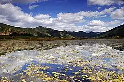 The Gaizu River, flowing out of the lake at its southeast end, has a controlled outlet that is only operated during the rainy season and remains closed from September to May. Lugu Lake is snowbound for three months a year; in the autumn and spring, it has a cool and dry climate with warm daytime temperatures.[4][5][6]